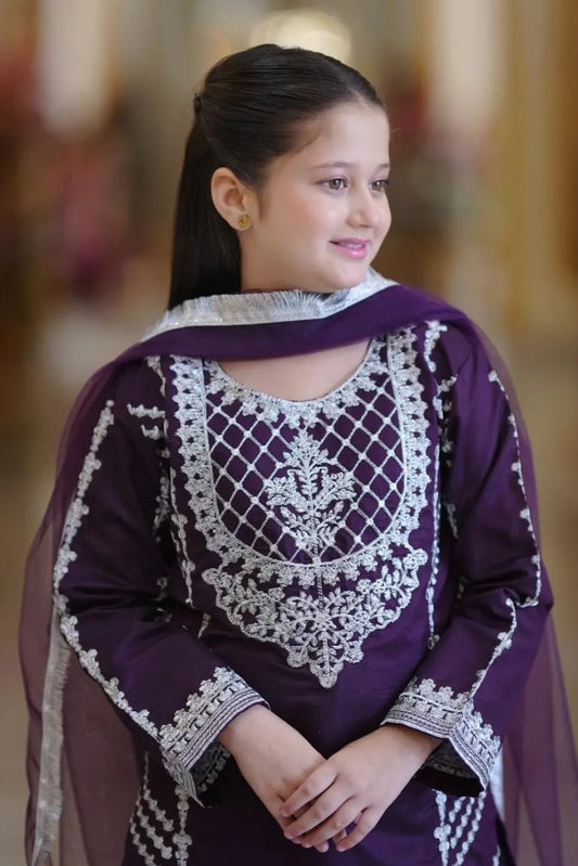 Purple Crepe Kidswear Girl Kameez with Plazo Suit & Dupatta Dress for Kids for Wedding - Embroidery Work -