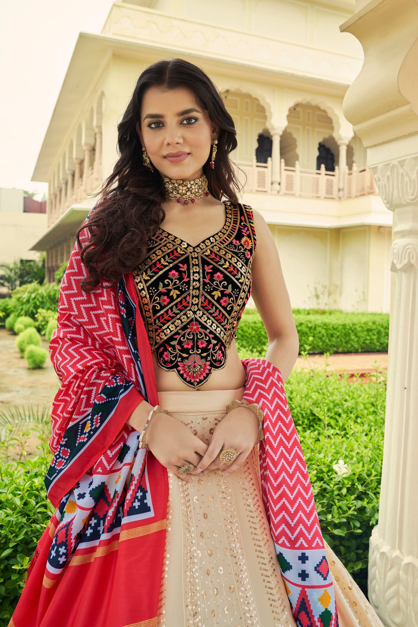 This Beige lehenga choli features intricate embroidery, luxurious georgette fabric, and elegant thread and sequence work, making it an excellent choice for formal occasions such as weddings and festivals. It offers comfort and style without compromise..