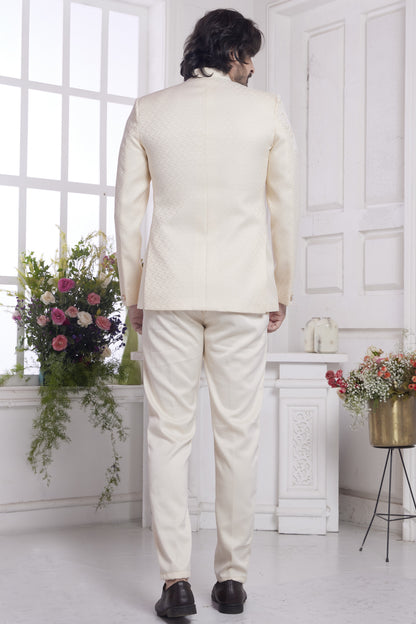 Cream Jacquard Silk Traditional Jodhpuri Suits with Pant for Men for Wedding - Embroidery Work