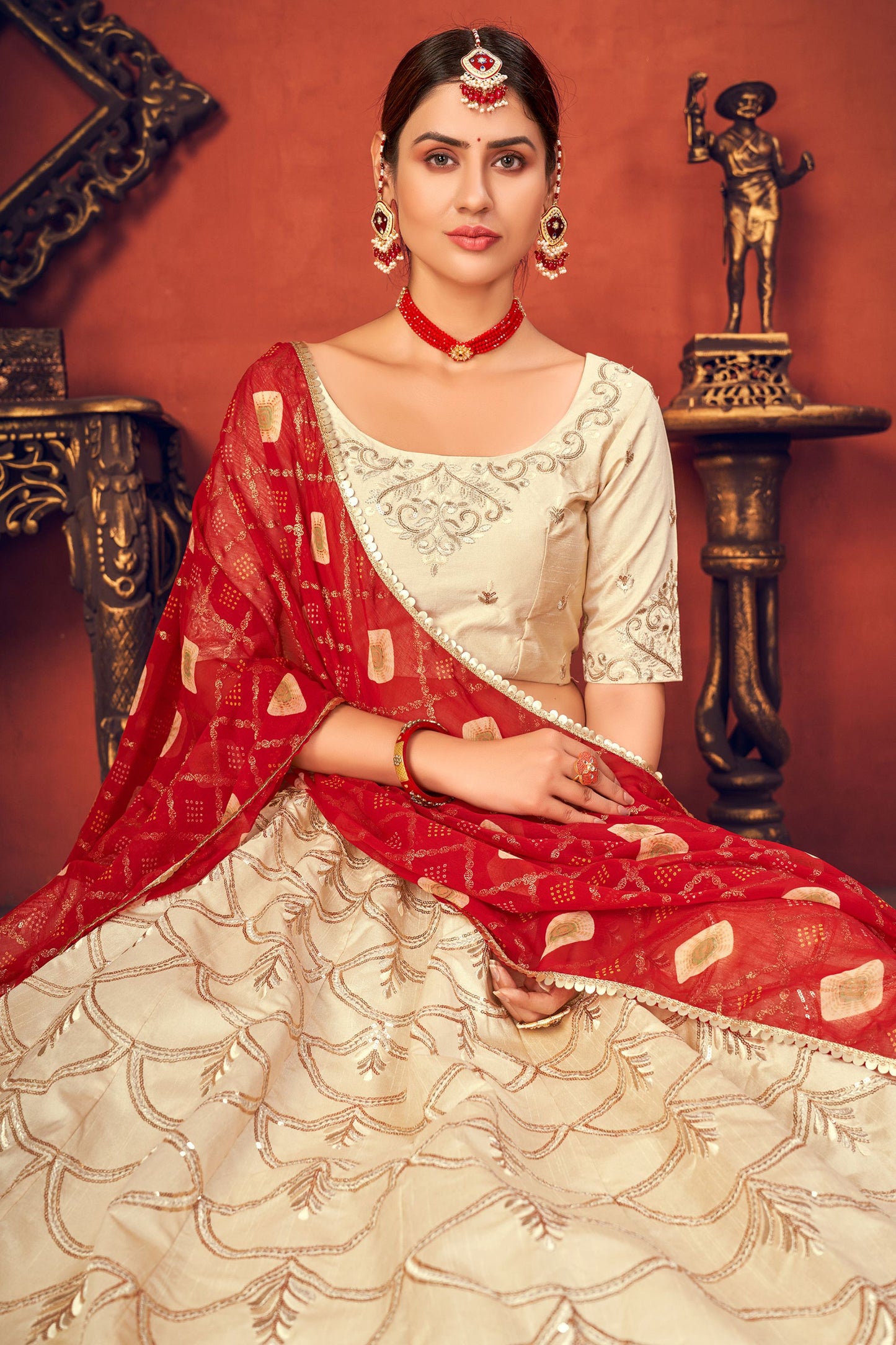 Beige Pakistani Art Silk Lehenga Choli For Indian Festivals & Weddings - Sequence Embroidery Work, Thread Embroidery Work, Foil Mirror Work,