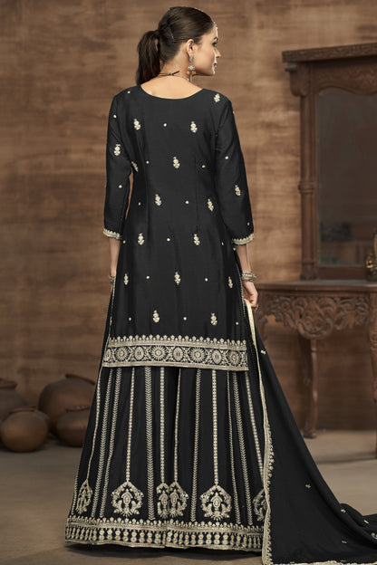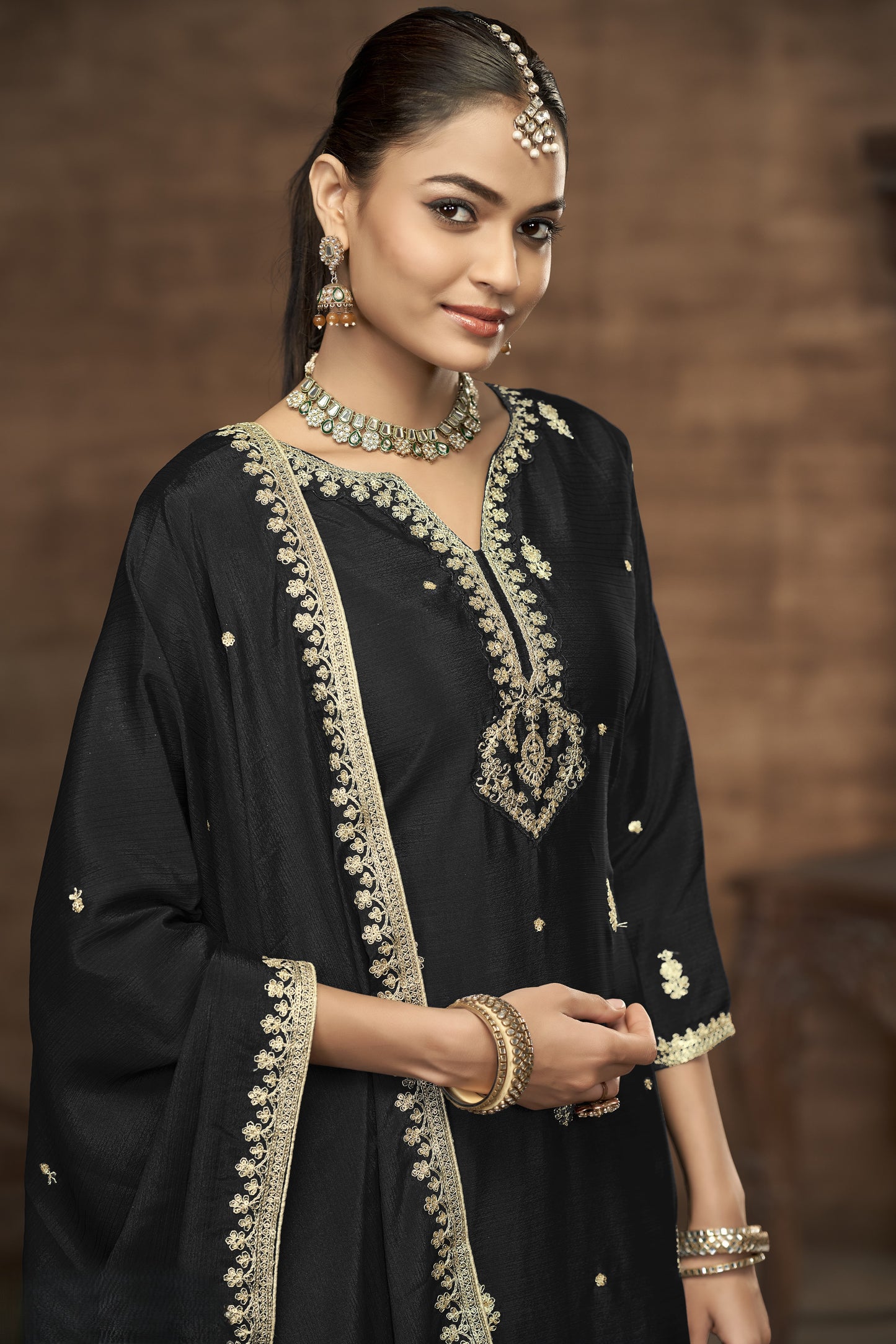 Black Chinon Silk Palazzo Suit For Indian Wedding & Pakistani Festival - Embroidery Work