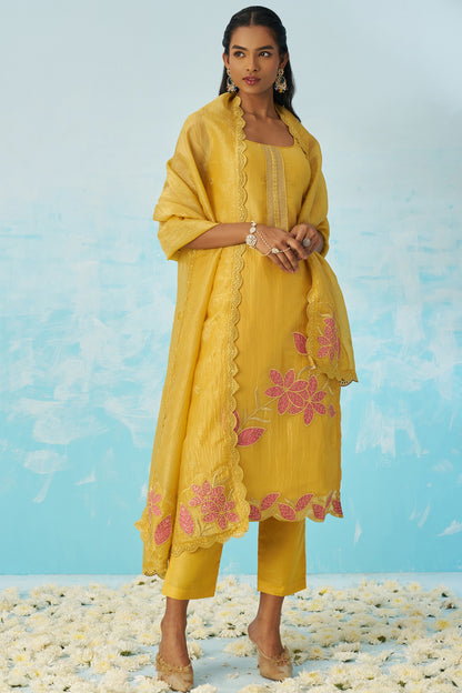 Elevate your style with our Yellow Crush Fabric Kameez, Pant & Crush Fabric Dupatta combo! This fab Indian outfit boasts intricate Embroidery and a charming Print, perfect for any occasion. Let your fashion game stand out with this unique and beautiful ensemble.