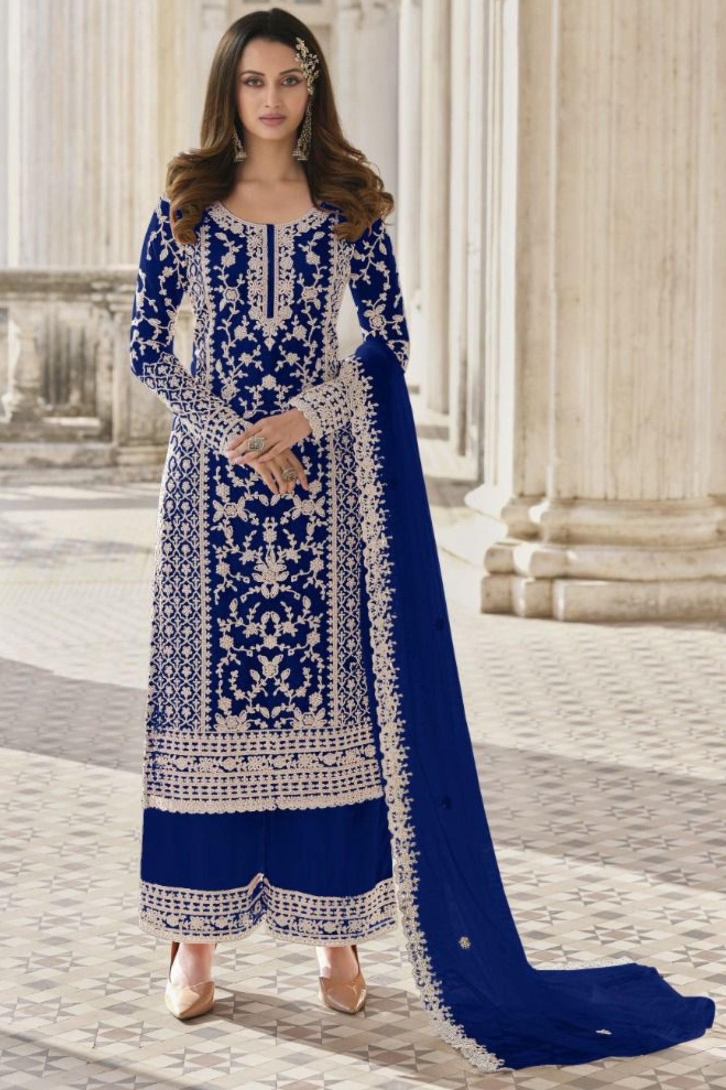 Discover our collection of Blue Net Kameez Plazzo Suits for Indian weddings & Pakistani festivals - detailed with stunning Embroidery Work. Find your perfect traditional or designer partywear Plazzo from Pakistan, complete with exquisite dupatta details.