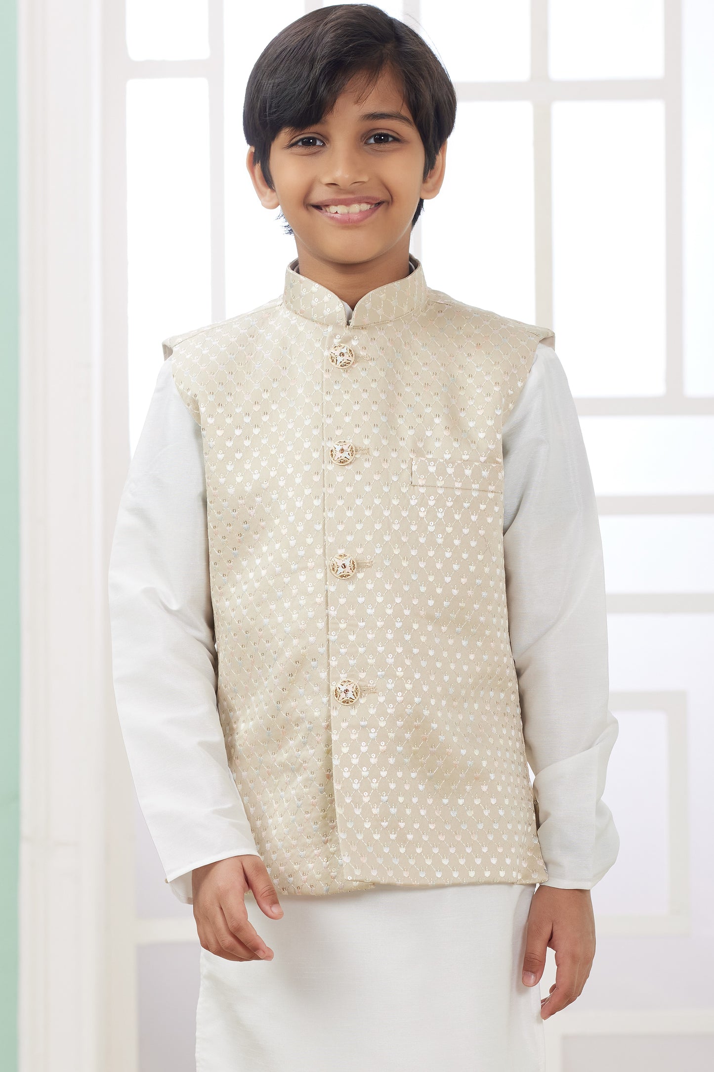 Cream Art Silk 3 Piece Kids Wear Boys Suit Kurta Pajama with Waistcoat Nehru Jacket for Kids for Festivals & Wedding - Embroidery Work