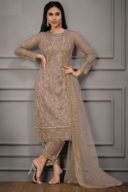 Light Brown Net Kameez with Pant For Indian Suit Festivals & Pakistani Weddings - Embroidery Work