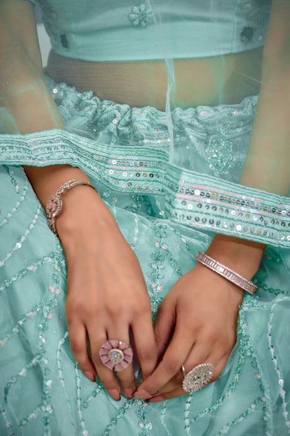 Purchase this popular Pakistani Cyan Lehenga Choli for Weddings and Festivals. Shop online for the in-demand Traditional Designer Partywear Net Lehenga Choli paired with a Net Dupatta. This Indian ensemble features stunning Thread Embroidery Work, Sequence Embroidery Work..