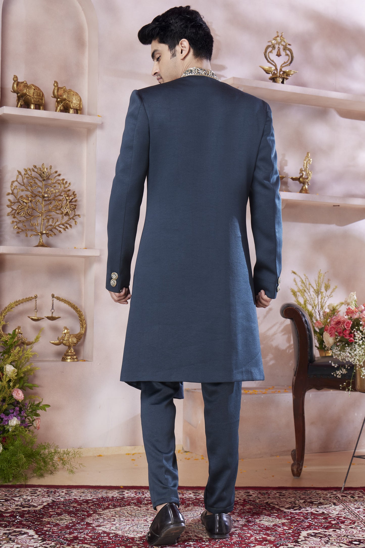 Slate Blue Art Silk Indo Western Traditional Sherwani Long Kurta & Pant Suit for Men for Wedding - Embroidery Work