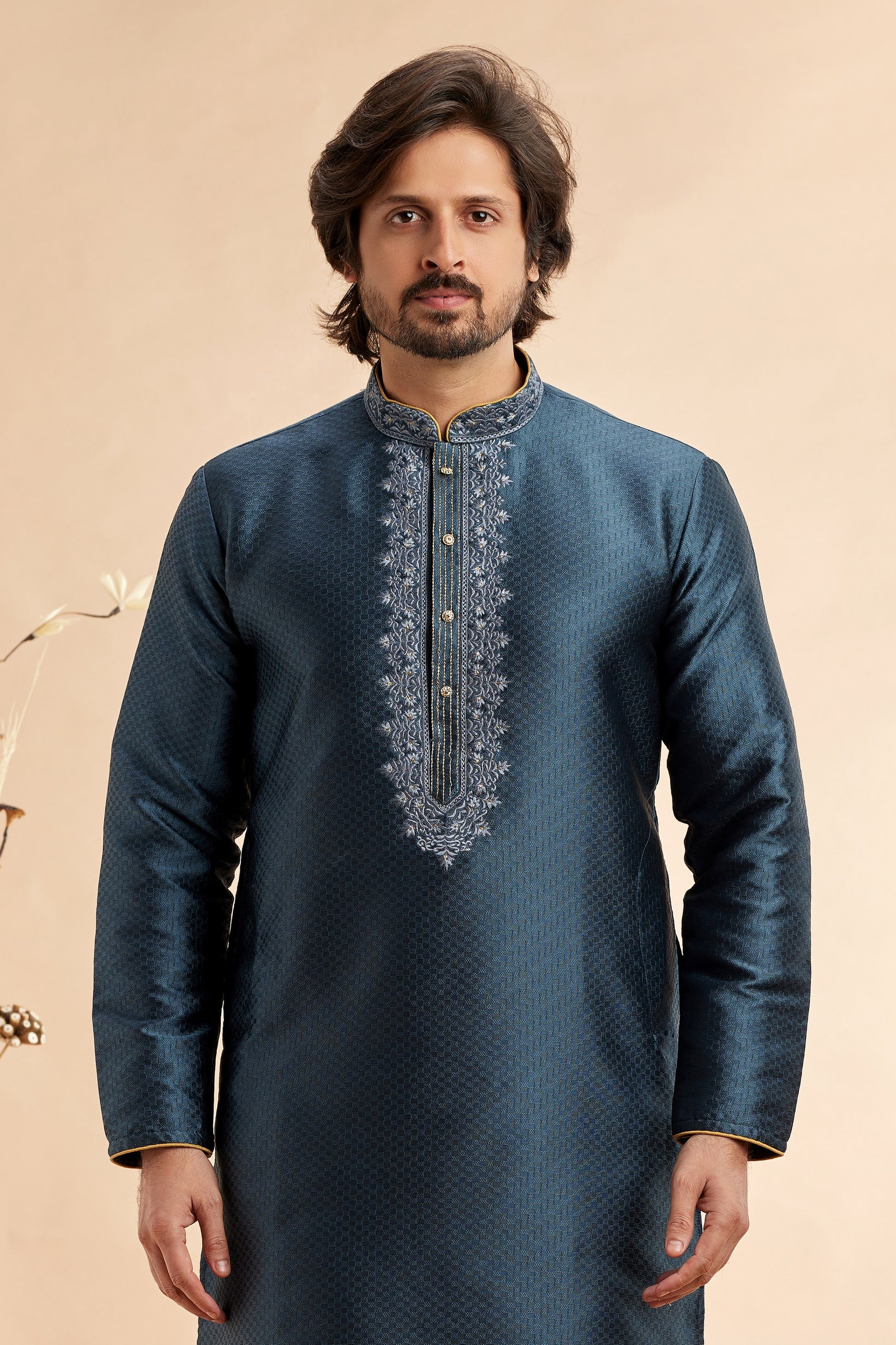 Dark Gray Jacquard Art Silk Plain Kurta Pajama for Men for Festival & Wedding - Embroidery Work