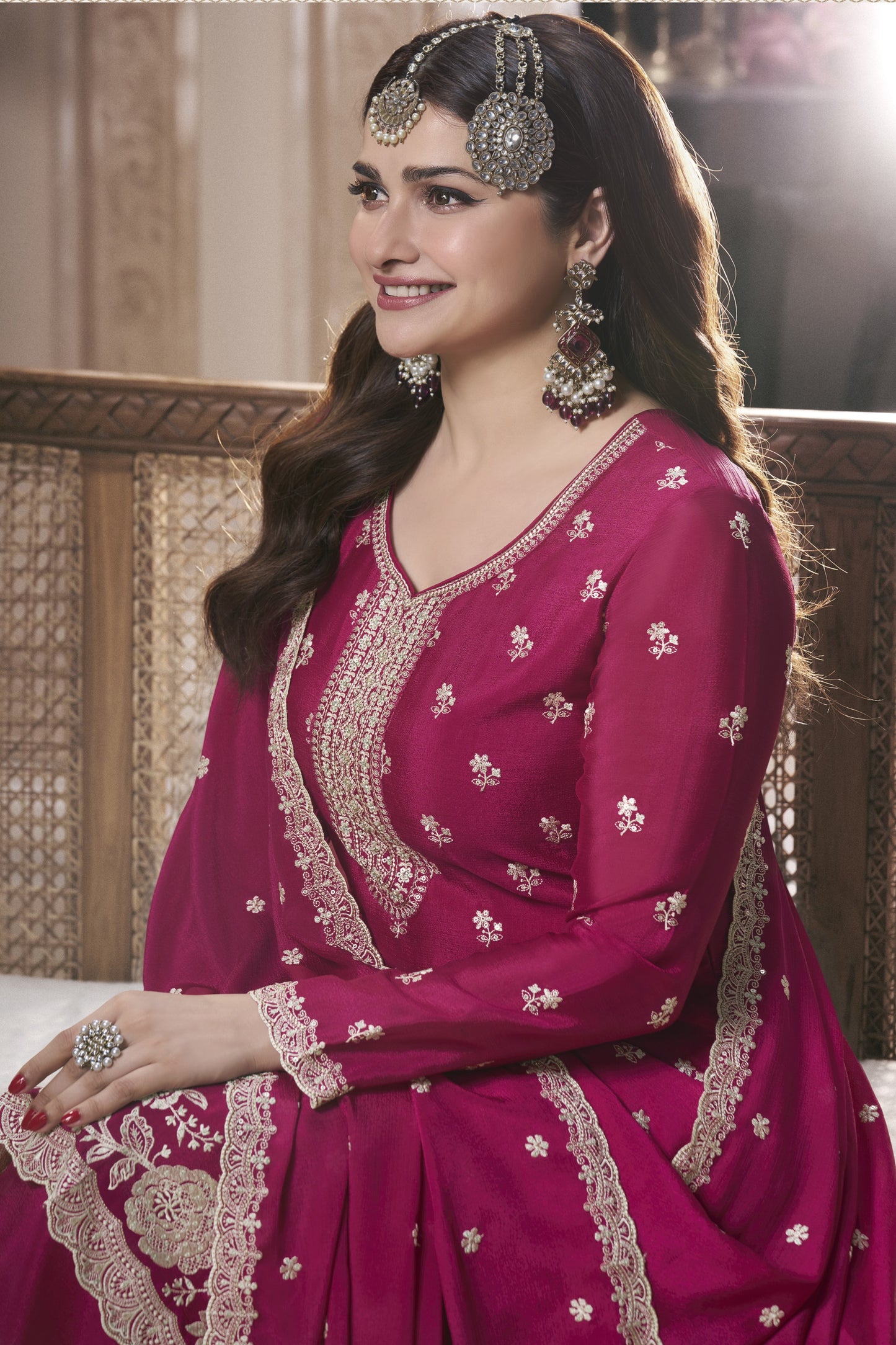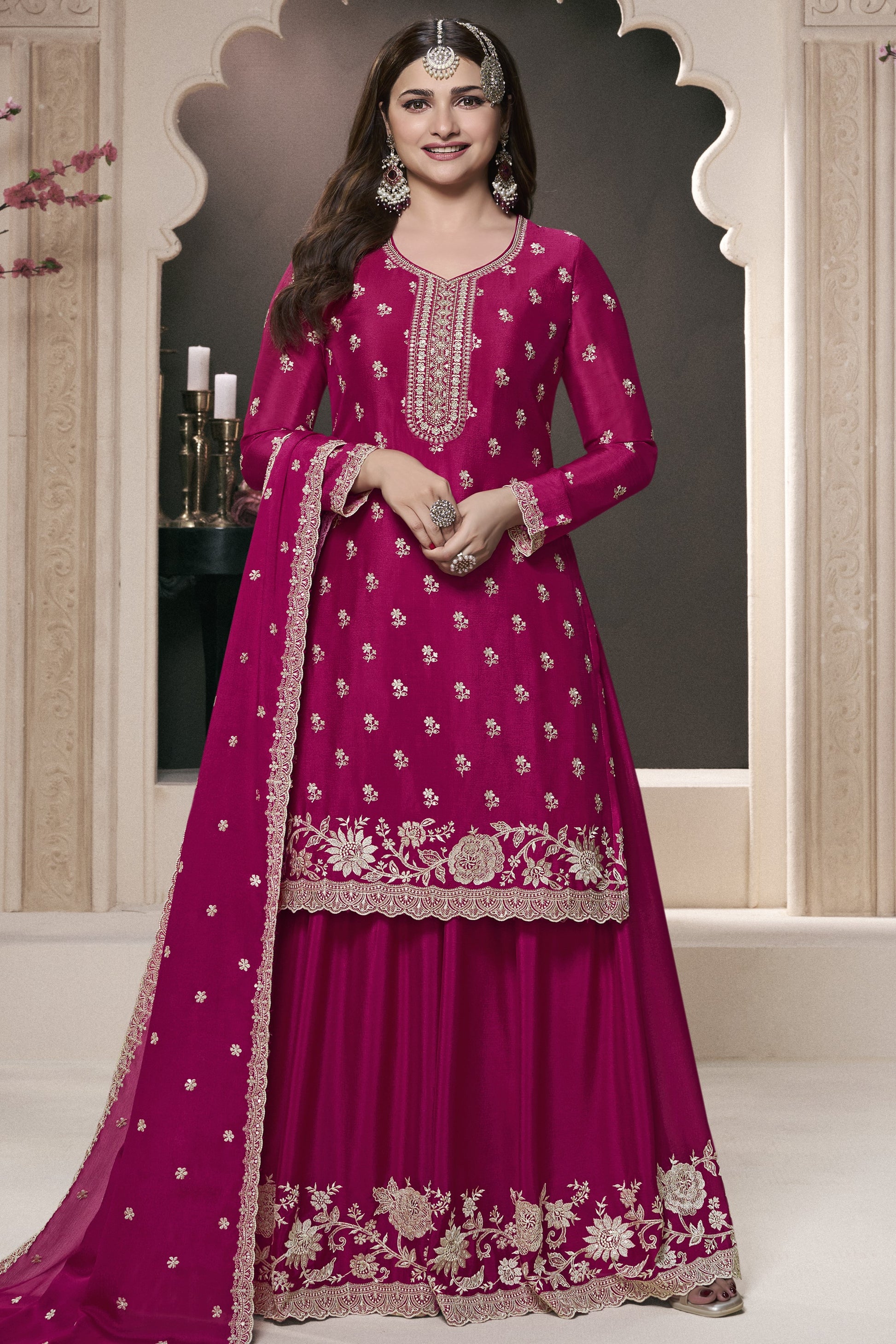 Elevate your festive look with our stunning Dark Pink Chinon Silk Sharara Kameez Suit. Designed for elegance and comfort, this exquisite piece is perfect among sharara suits for wedding events, including vibrant Sangeet celebrations. Featuring intricate embroidery work and complemented by a matching dupatta, this outfit ensures you make a truly memorable statement at any special occasion.
