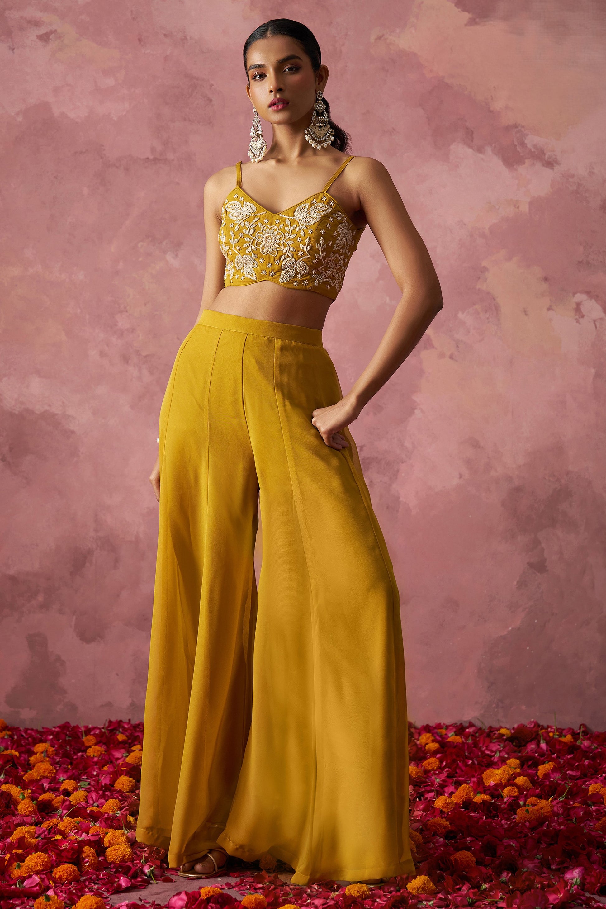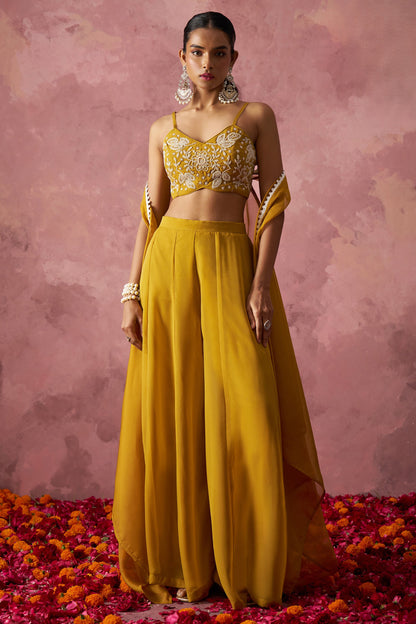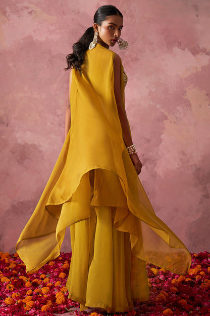 Elevate your Indian festival and Pakistani wedding style with this Golden Georgette Palazzo Choli. The essential Traditional Designer Partywear Palazzo Choli, complete with a cape, features exquisite Khatli Work and Hand Work. Bring a touch of elegance and trend to your wardrobe now!..