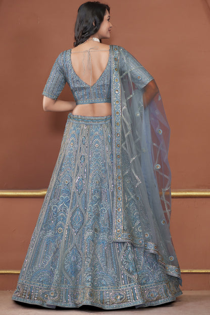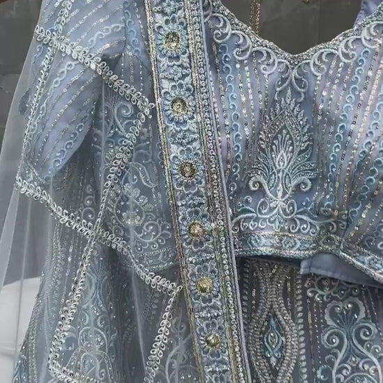Gray Blue Net Lehenga Choli For Indian Festivals & Pakistani Weddings Dress - Zarkan Work