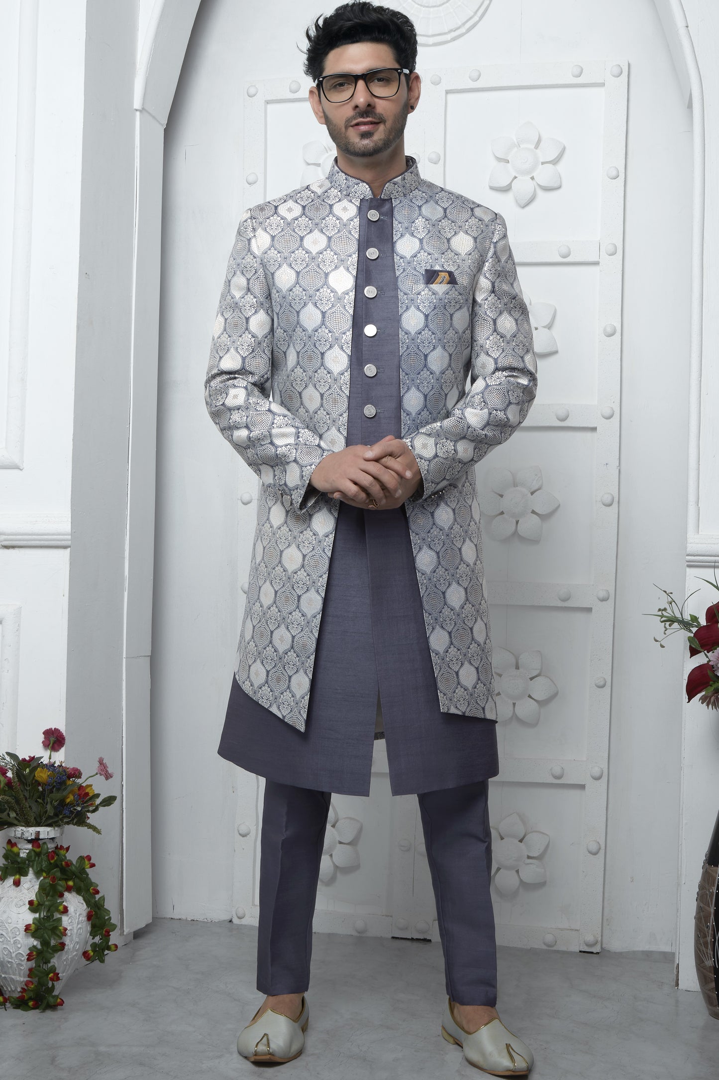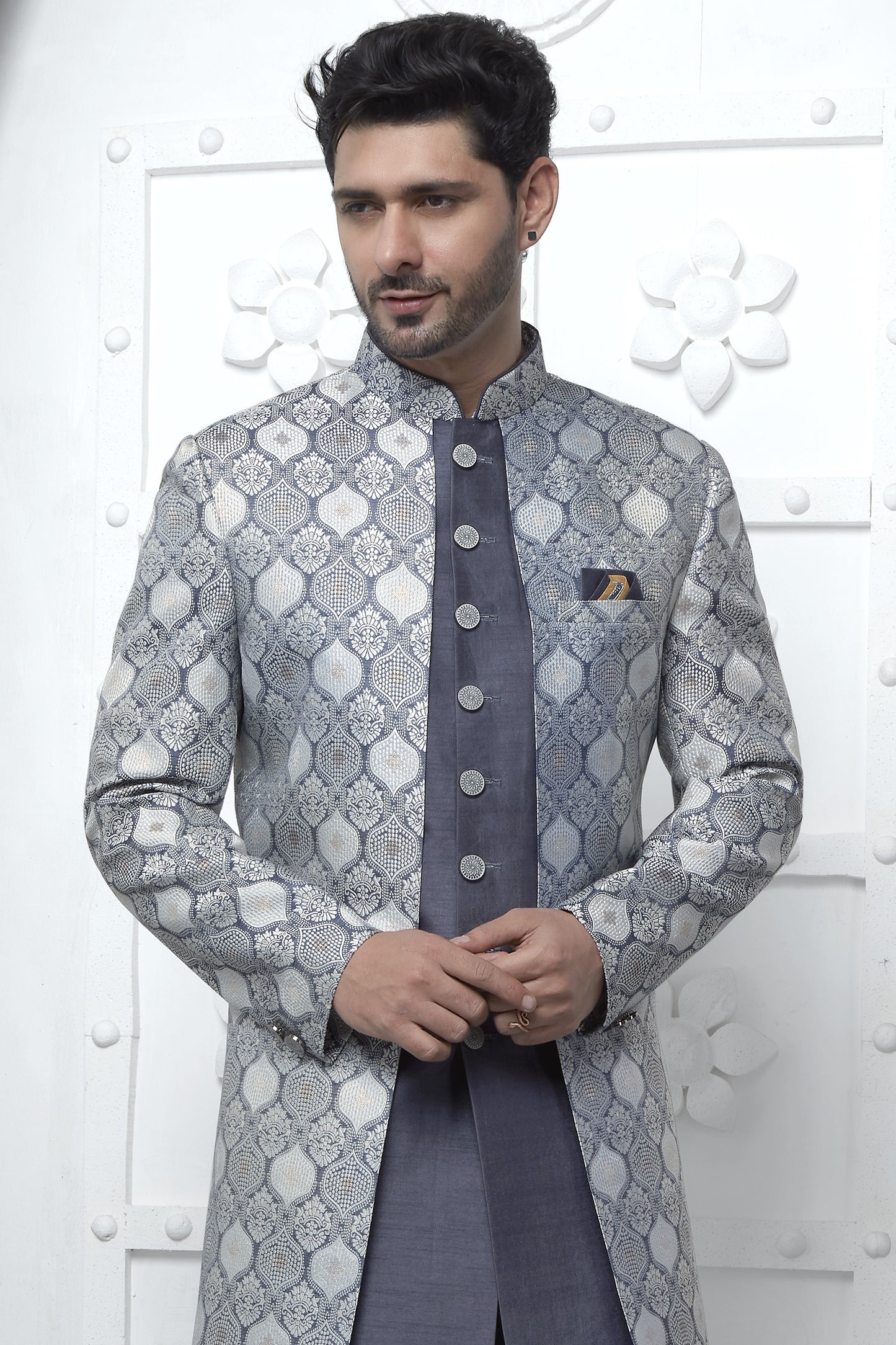 This Gray Jacquard Silk Indowestern Suit is perfect for Weddings and Parties, showcasing exquisite craftsmanship that will make a lasting impact. The set incorporates a Long Kurta, Jacket, and pants, providing a complete and memorable appearance..