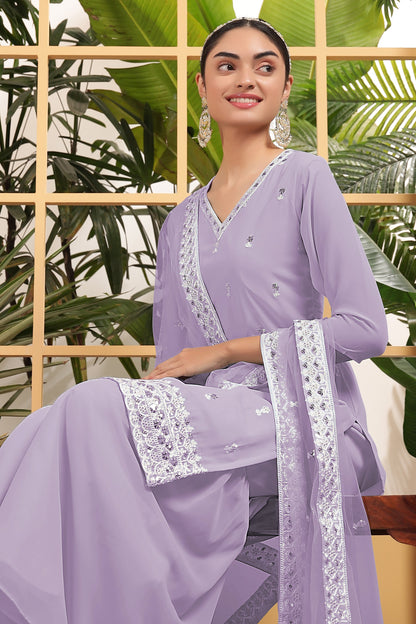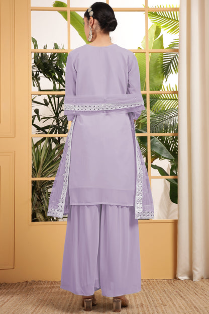 Experience the elegance perfect for any Marriage celebration with our expertly crafted Light Purple Georgette gharara dress. Designed with intricate embroidery work throughout and complemented by a delicate Net dupatta, this traditional designer outfit is meticulously crafted for stunning formal events. Elevate your occasion wardrobe and make a captivating statement with this beautiful cultural ensemble.