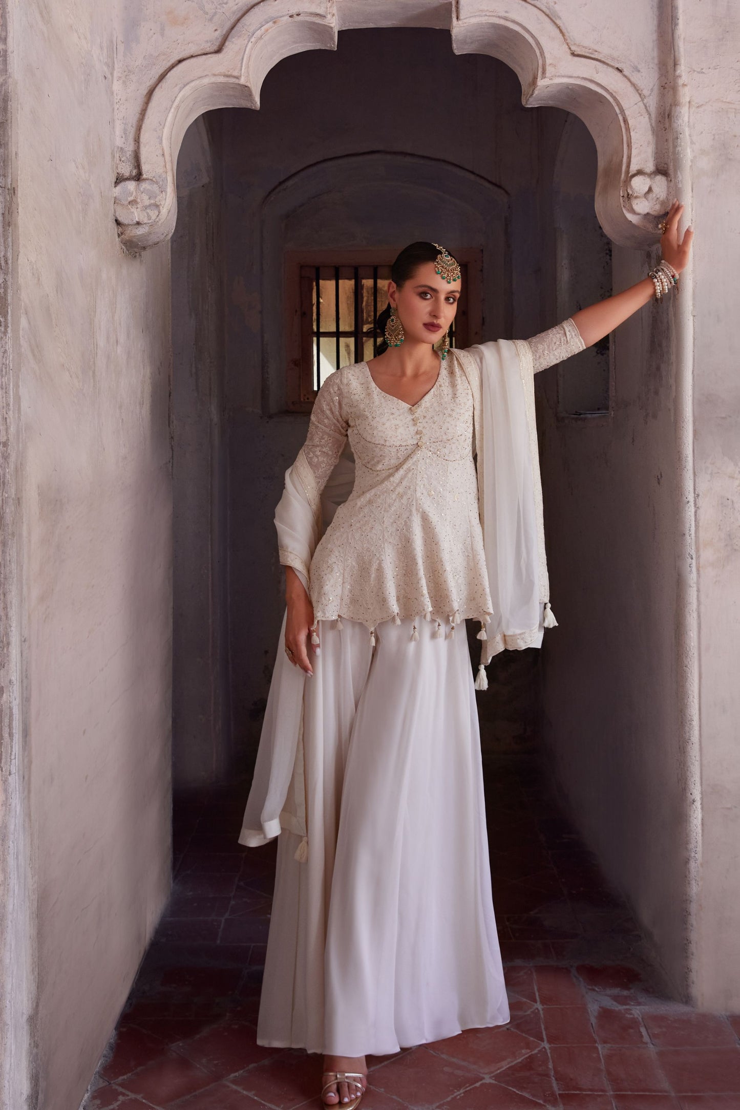 Experience the newest trend in Indian fashion with the Off White Georgette Palazzo Suit. Ideal for both weddings and festivals, this Traditional Designer Partywear Palazzo Suit is a must-have. It features exquisite Thread & Sequence Embroidery Work and Zari Work, adding a touch of elegance to any wardrobe. Purchase now to elevate your fashion game..