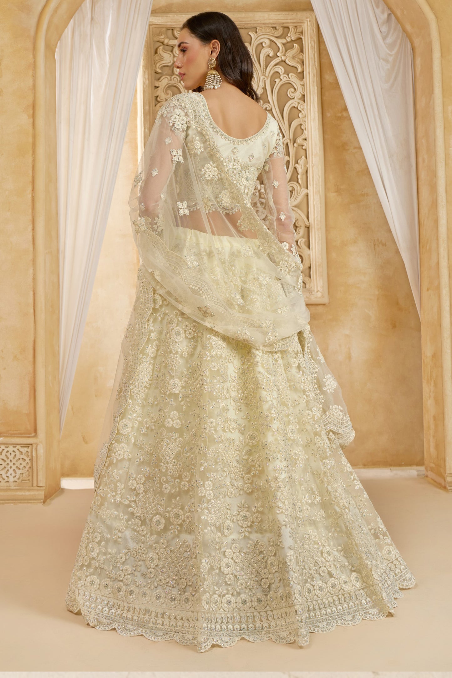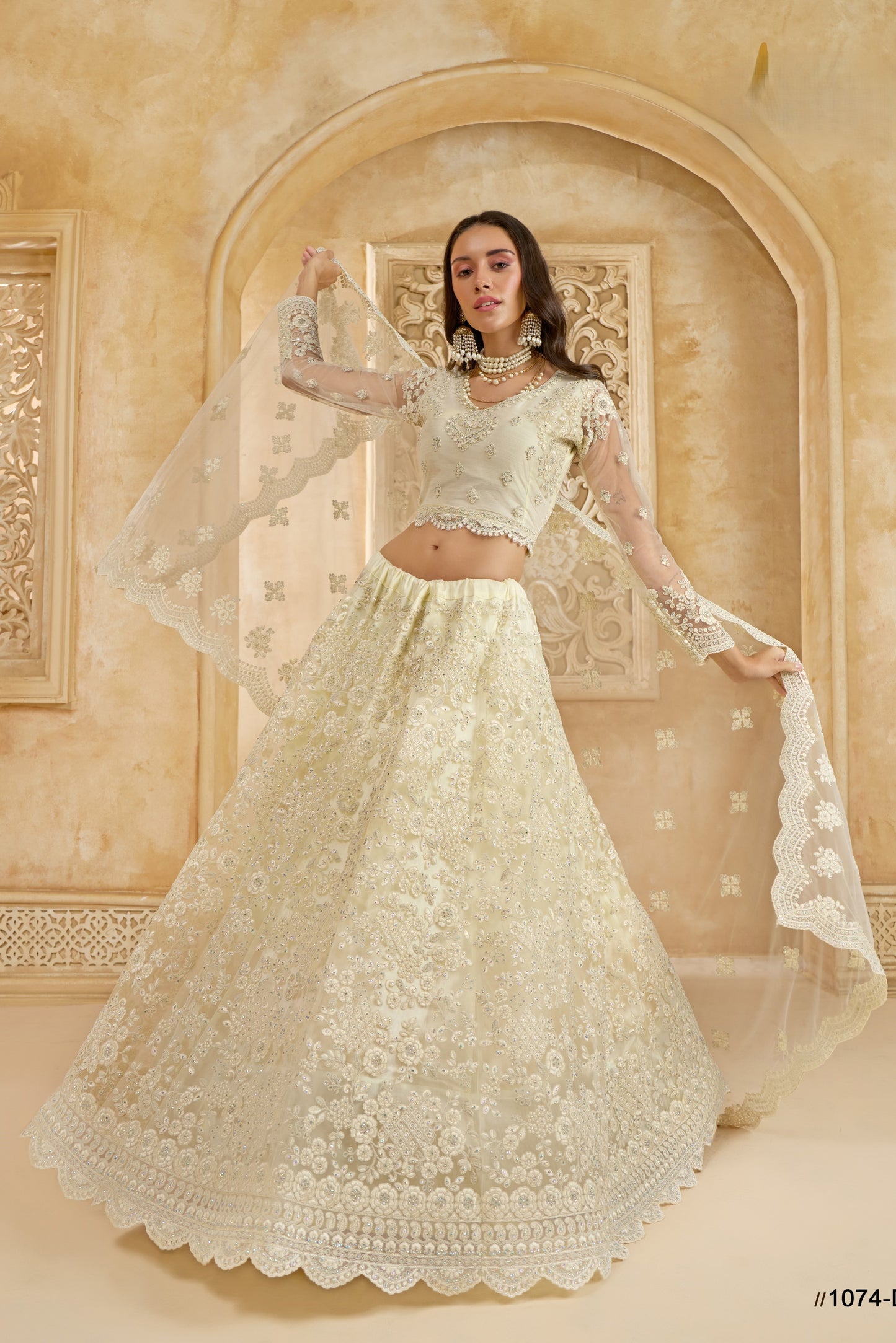 Off White Net Lehenga Choli For Wedding Guest in Indian Festivals & Pakistani Weddings Dress - Thread Embroidery Work, Stone Work