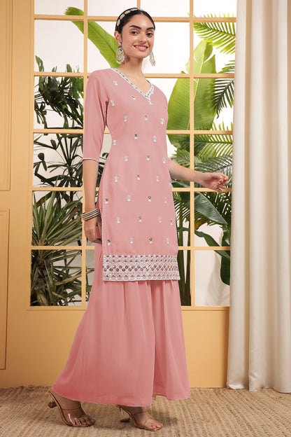Step into vibrant traditions with our handcrafted Light Pink Georgette pakistani sharara suit. This stunning outfit features delicate embroidery work across the design, paired beautifully with a complementary net dupatta, making it perfect for special formal occasions. Whether attending a wedding or celebrating an Engagement, this traditional designer sharara offers both elegance and cultural charm. Enhance your wardrobe and immerse yourself in a look that's both captivating and timeless.