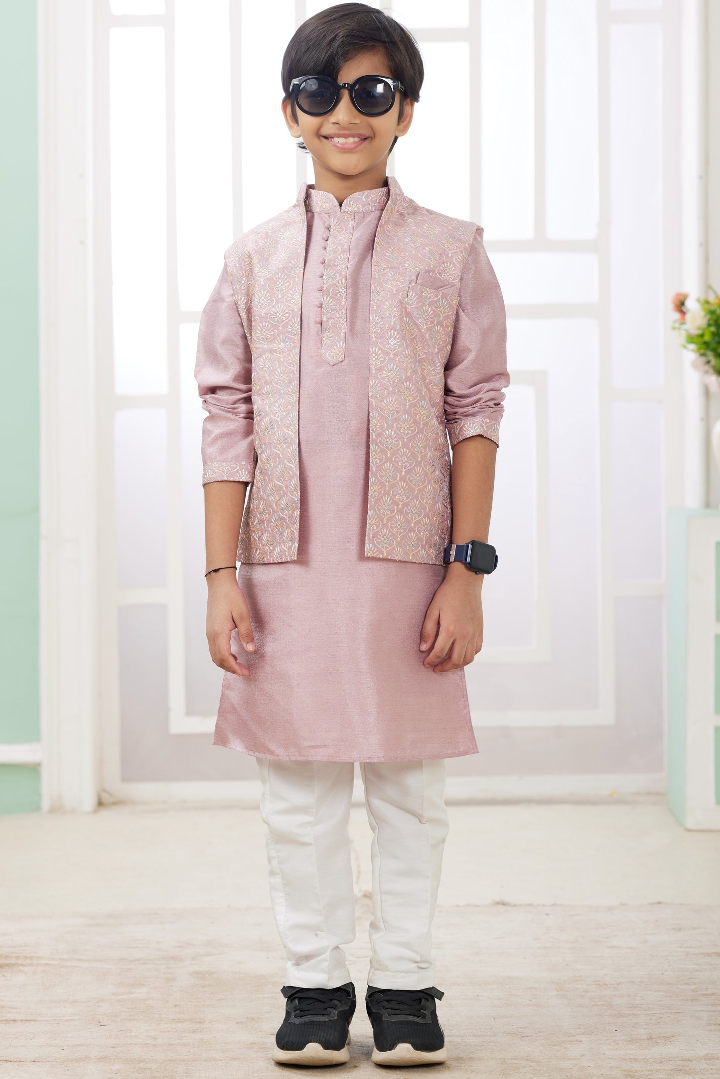 Rose Gold Art Silk 3 Piece Kids Wear Boys Suit Kurta Pajama with Waistcoat Nehru Jacket for Kids for Festivals & Wedding - Embroidery Work