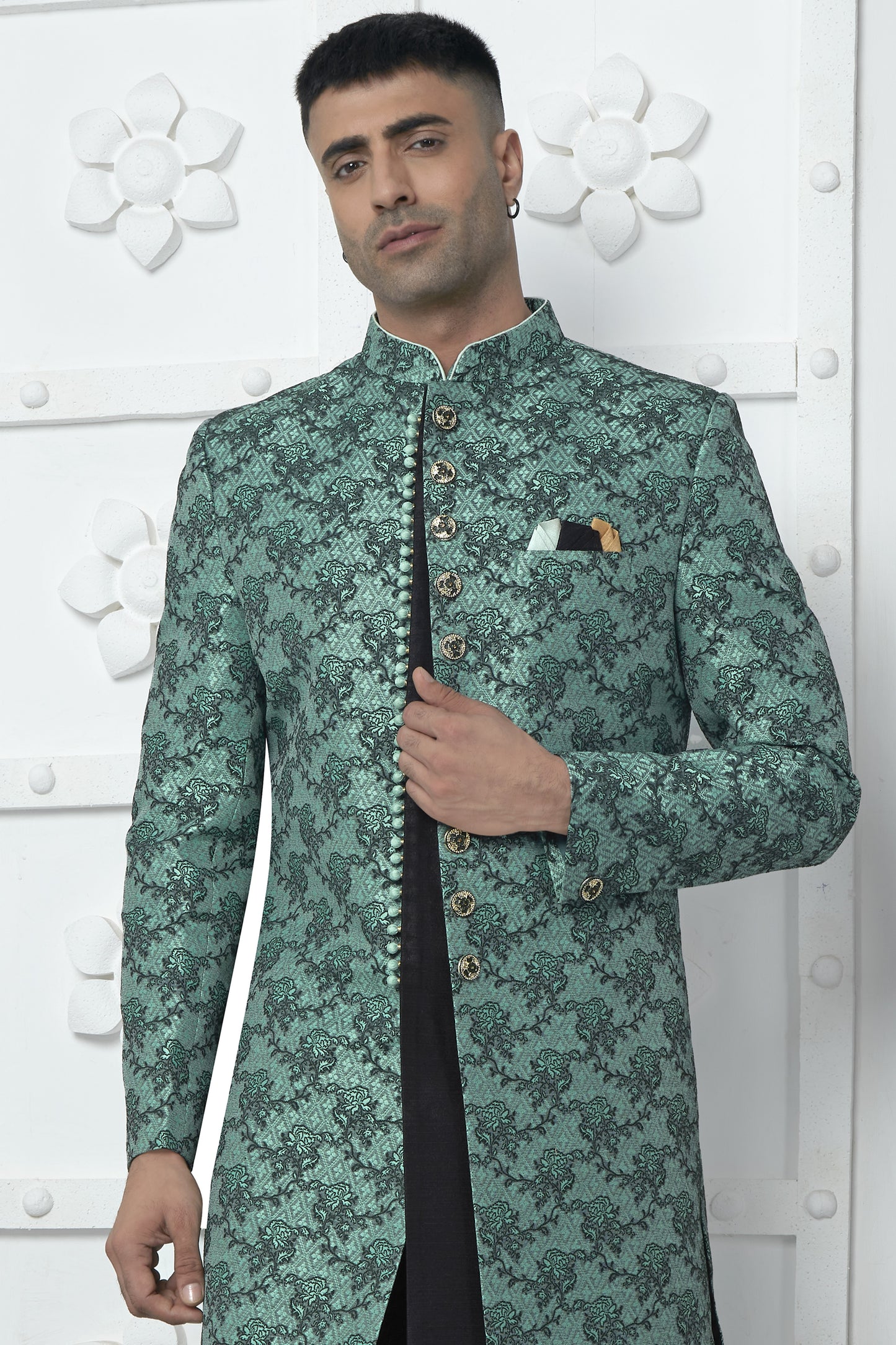 This stylish Teal Green Jacquard Silk Indo Western Suit is ideal for Weddings and Parties, featuring expert craftsmanship that will leave a lasting impression. The set includes a Long Kurta, Jacket, and pants, giving a complete and unforgettable look..