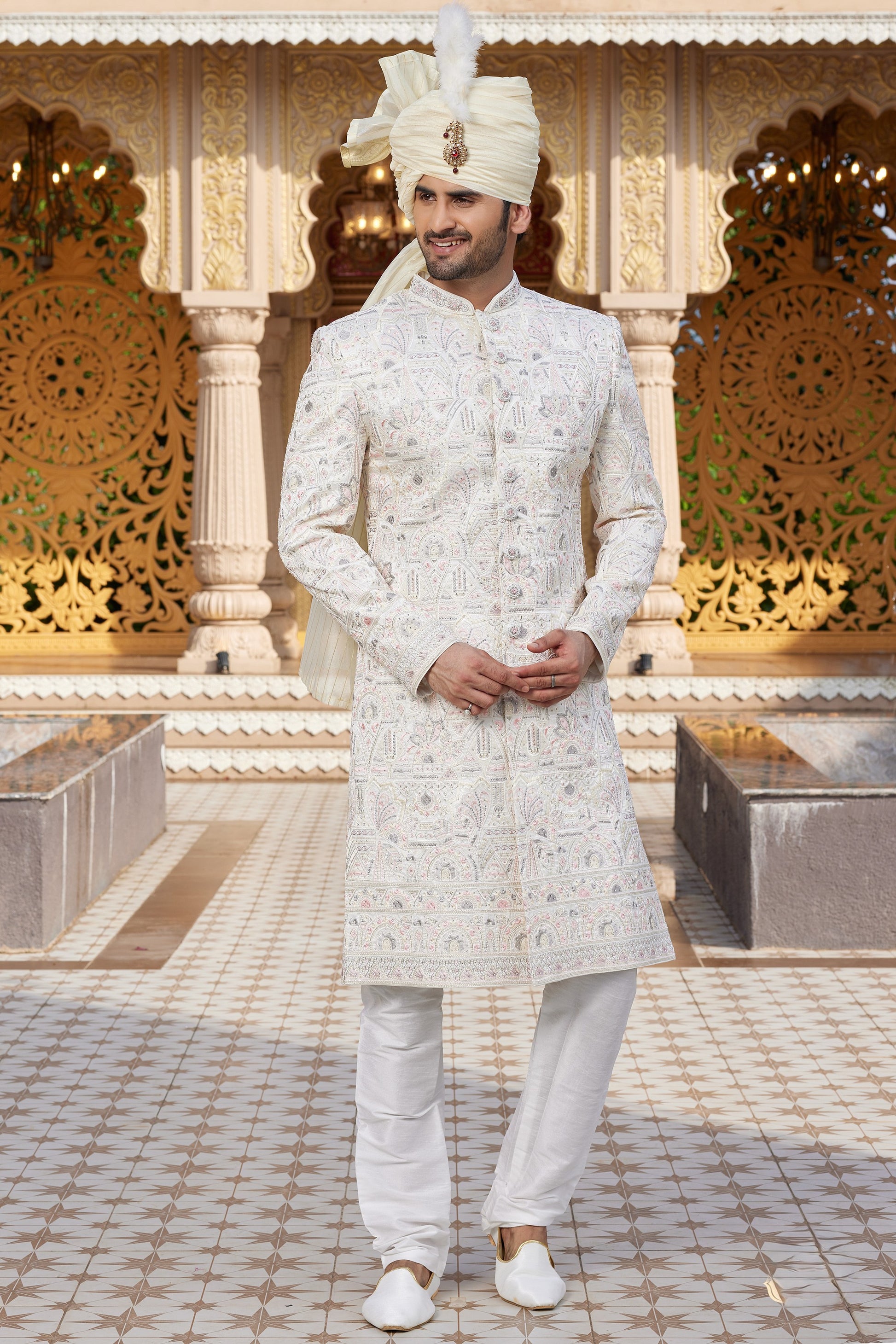 White Art Silk Traditional Sherwani Long Kurta & Pant for Men for Wedding - Embroidery Work